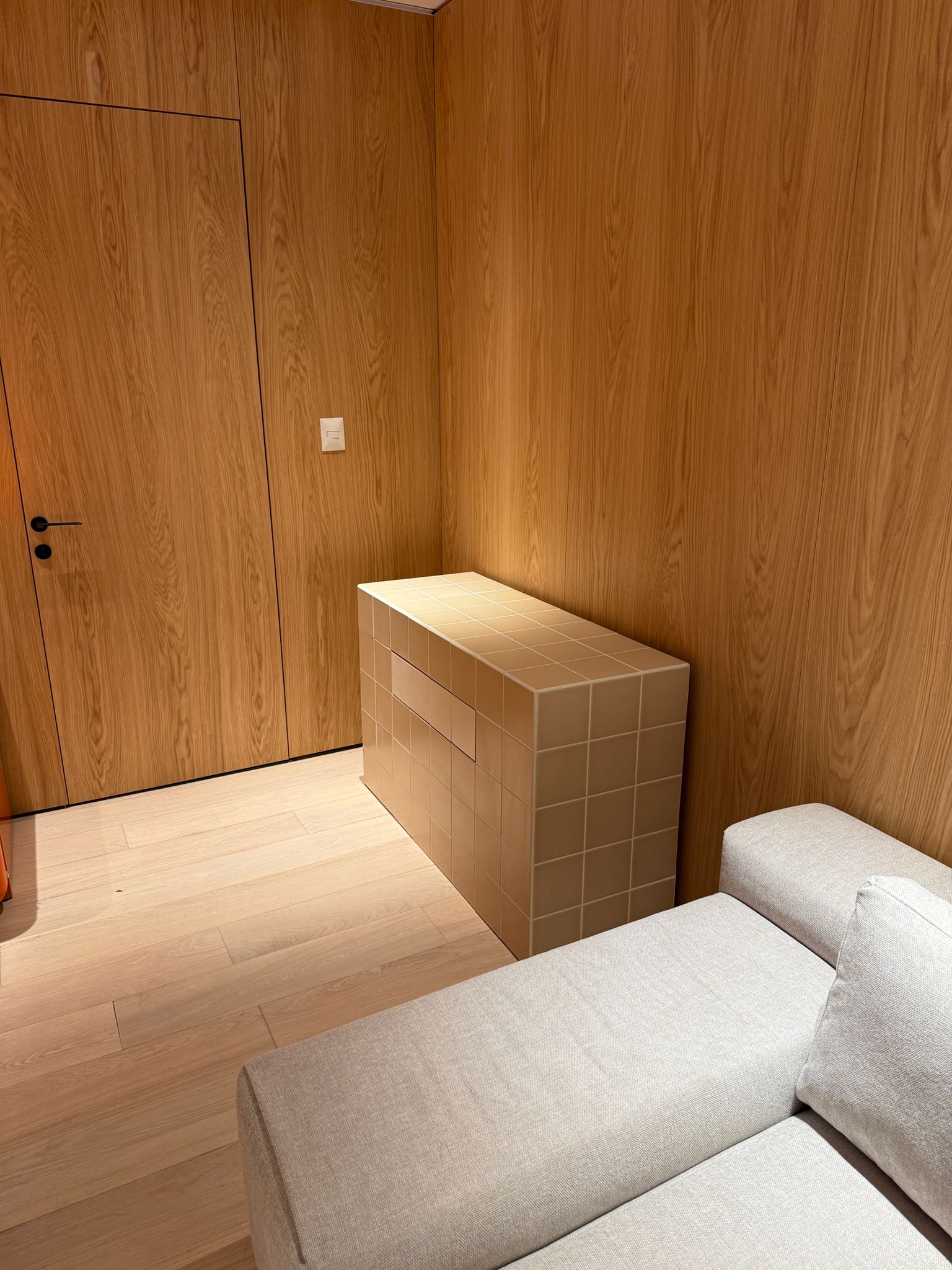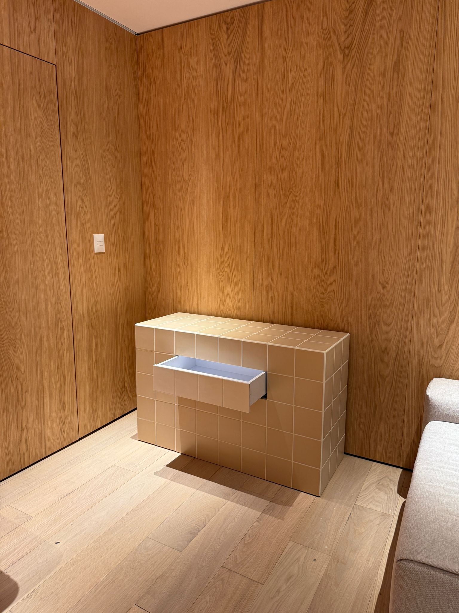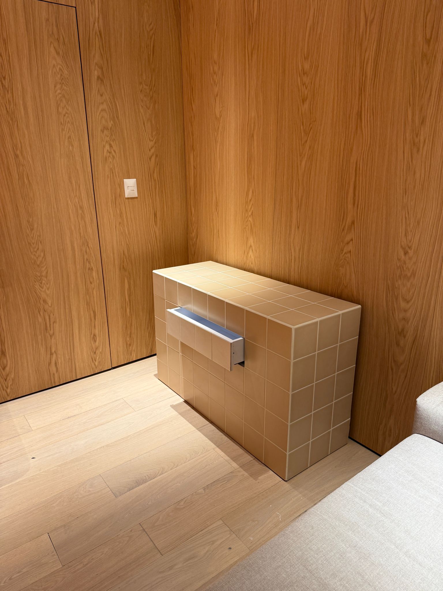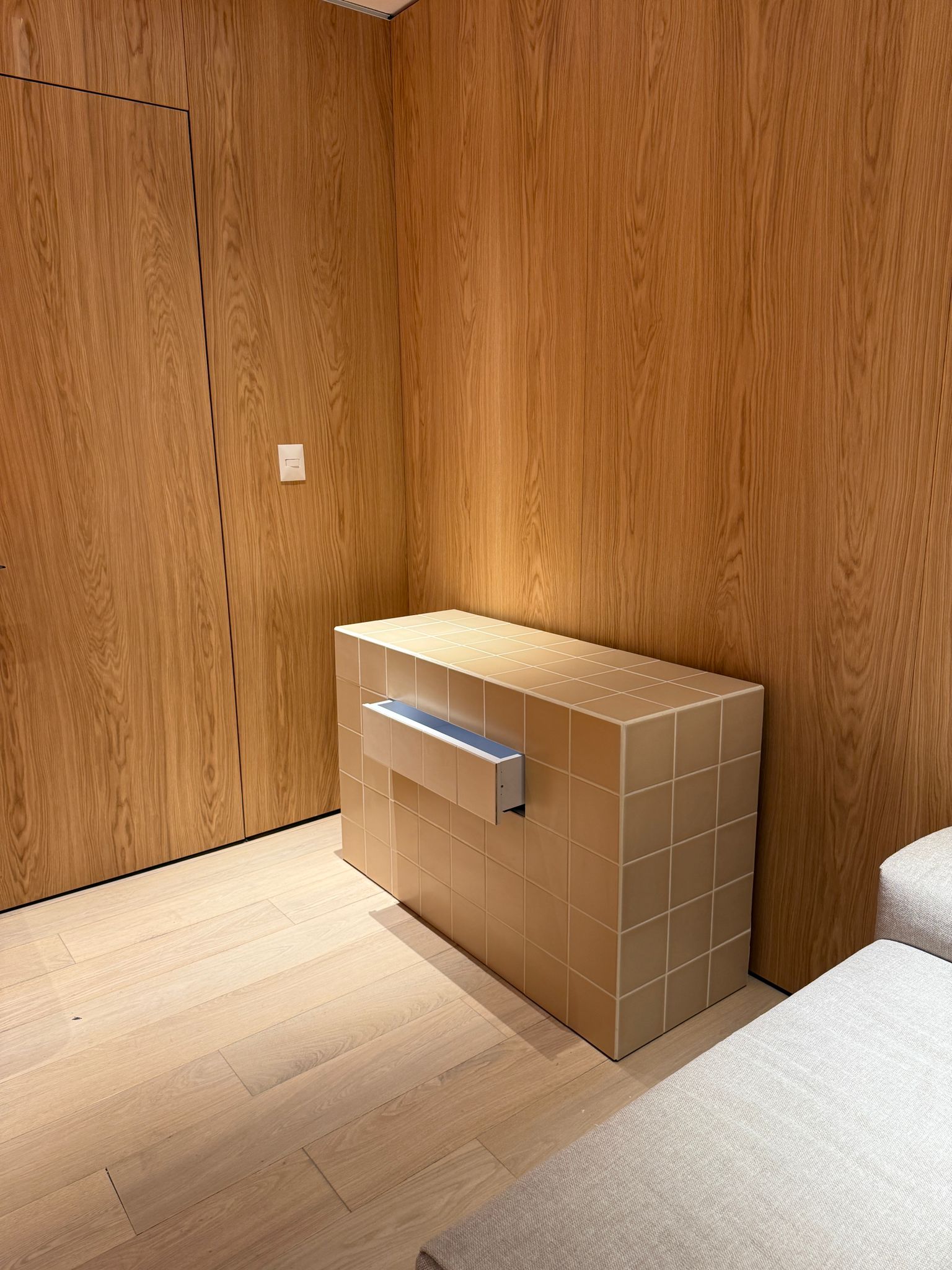 אי מטבח כולל מגירה אינטגרלית בקו חזית נקי, עם מנגון לפתיחה וסגירה חלקה, שקטה ומבוקר